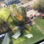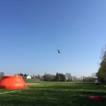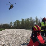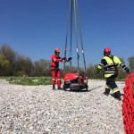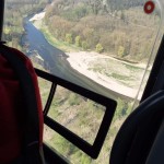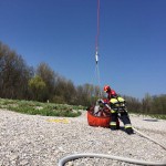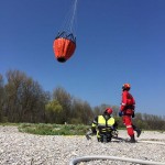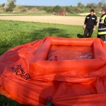 Von dort wurde die Übung mit dem Aufbau der Wasserversorgung und des Faltbehälters begonnen. Die Trupps der freiwilligen Feuerwehren Pfrombach/Aich und Thonstetten wurden jeweils zusammen mit einem Trupp der Münchner Flughelfer zu den Einsatzpunkten „Kiesbank“, „Dammkrone“ und „Waldlichtung“ ausgeflogen. Anschließend wurden durch die Hubschrauberbesatzung benötigte Geräte (z.B. TS und Schläuche), sowie Lasten (bspw. Holzbalken und Sandsäcke) an die Einsatzpunkte transportiert. Nachdem die Übung ungeplant durch einen Flug nach Allershausen unterbrochen werden musste, übten die Kameraden, den Pilot beim Transport von Löschwasser und bei der Befüllung der Transportbehälter (ALB BAMBI PACKET und SEMAT) zu unterstützen. So konnte unter anderem der Faltbehälter am Einsatzort „Dammkrone“ mit Löschwasser versorgt werden.